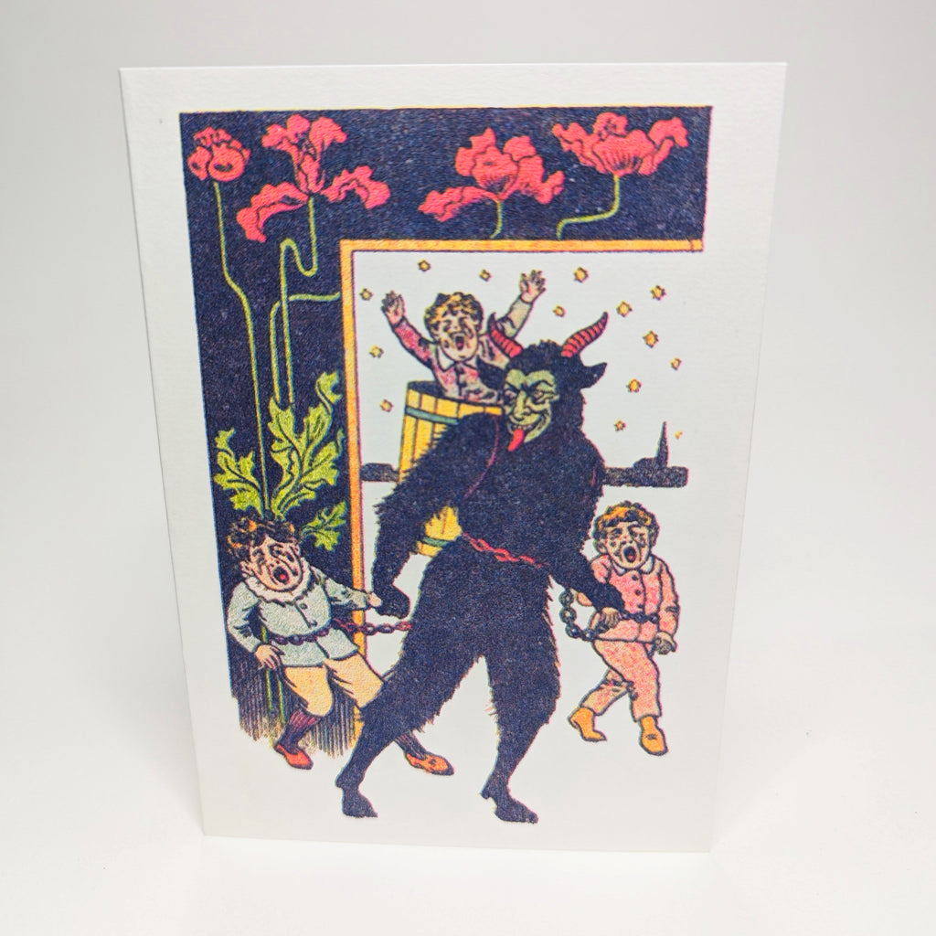 A6 Risograph printed Krampus greetings card, printed on 300gsm Munken paper with a recycled envelope.